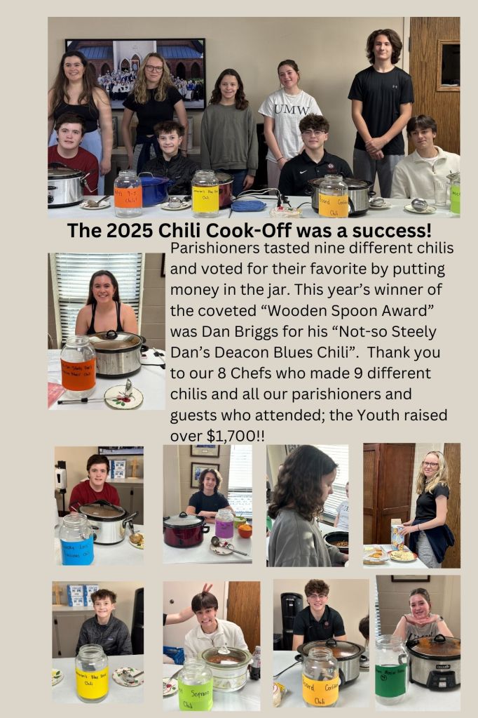 Since 2004, the middle and high school youth have hosted a Chili Cook-off. Parish members bring their best pot of chili, and everyone gets to taste and vote (with money) for their favorite. Winners are awarded the coveted “Wooden Spoon” Award. Money is raised for Mission Trips, a Pilgrimage trip, service projects, and fun activities throughout the year.