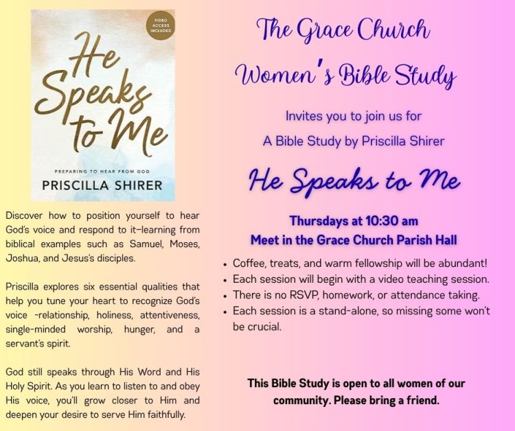 The women’s Bible study is every Thursday at 10:30 am in the Parish Hall. (Except Thanksgiving.)